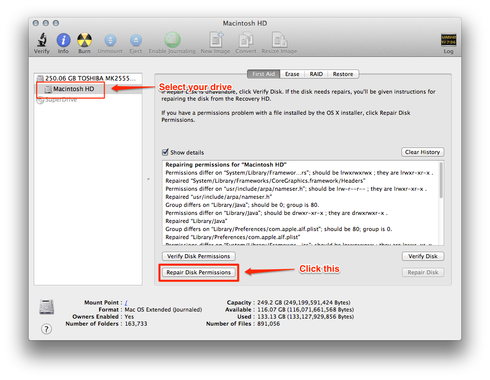 Select your disk (in my case, Macintosh HD) and click on the button that says "Repair Disk Permissions".